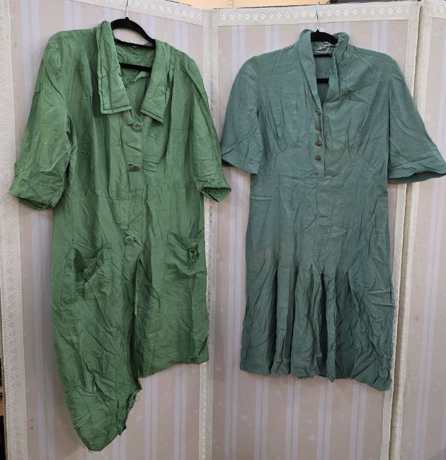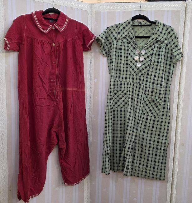Various mid-century 1940's/50's dresses to include turquoise cotton, embroidered in similar colours, with front pockets, puff sleeves, collarless V-neck neckline (lacking belt), a green cotton day dress, another green dress with a sailor collar, later edition buttons, front pockets with bows, three-quarter length sleeves, a check cotton day dress with mother-of-pearl button detail but possibly these have been added to the bodice, cap sleeves, a pink dressing gown/housecoat printed with blue and brown flowers, full-length sleeves, single button fastening, full-length, and a red cotton romper suit with white trim detail to the collar and short sleeves, this is possibly for a girl rather than a woman (6)