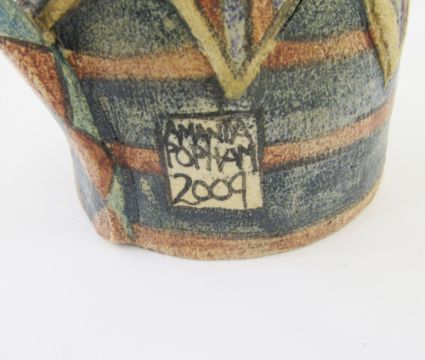 Amanda Popham, earthenware jug, head and shoulders man in hat thinking, signed and dated to reverse 2009, 19.5cm high x 8.5cm wide