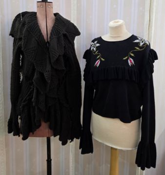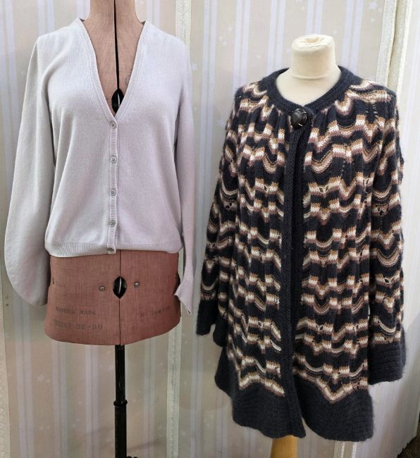 'Just Cavalli' brown knitted wool jacket, fall front lapels, deconstructed outside seams, scalloped hem size 42, Missoni wool long jacket, dark green, cream and tan pattern, large single button fastening to the neck, size L, Hayley Menzies black scoop neck jumper, frill to the bodice, shoulders and extended sleeves, floral design to front and back, and a JilSander cashmere pale fawn cardigan, size 36 (4)