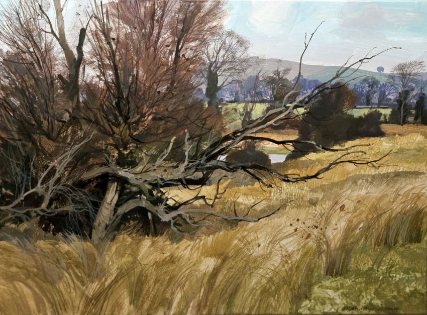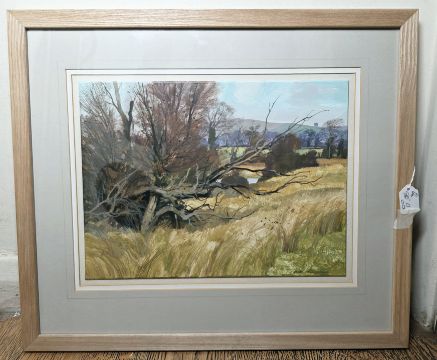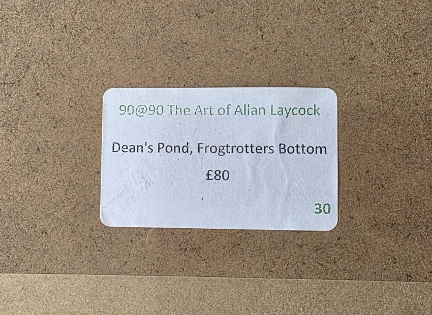 "Dean's Pond, Frogtrotters Bottom", landscape with trees and cornfield in foreground, labelled verso, 25cm x 34cm