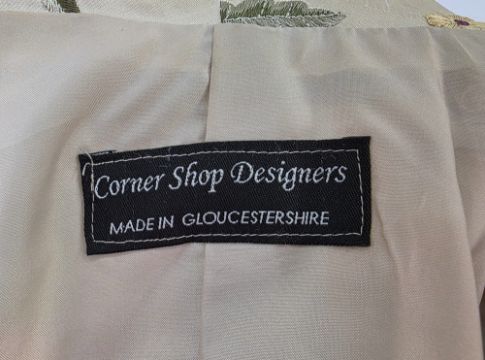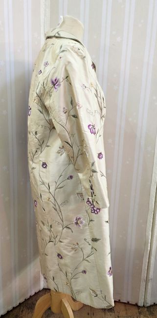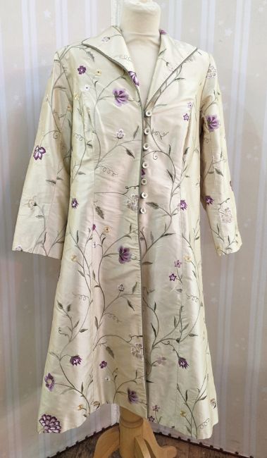 A silk embroidered modern coat labelled Corner Shop Designers made in Gloucestershire, ideal for a wedding or Ascot