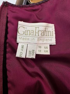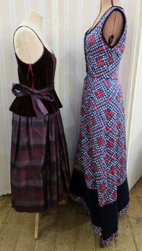 1970'S 'TROUBADOUR' maxi dress, red and white polka dots on a blue ground with red lines, quilted, black velvet border, lace fastening to the bodice, sleeveless with black velvet trim, labelled size 10, with Gina Fratini cocktail dress, deep maroon velvet bodice with peplum over a striped satin skirt, matching sash, labelled UK 12 (2)