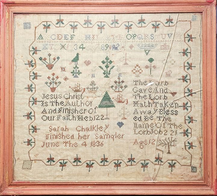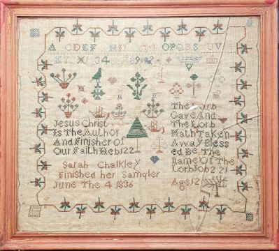 Sampler by Sarah Chalkley, finished her sampler June 4th 1836 aged 12, with religious verse, floral border, trees, birds, ships, alphabet and numbers (some wear in the centre but not affecting the letters or images), 29cm x 33cm, framed
