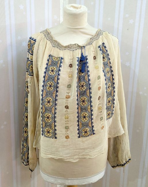 Muslin peasant style blouse - staining near cuff on RH sleeve. Two small spot stains to back. Slight discolouration line LH sleeve otherwise appears in good condtion.