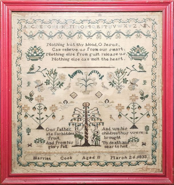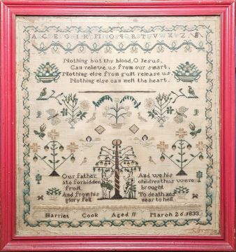 Sampler by Harriet Cook, aged 11, March 26th 1833, religious verse, border, Adam and Eve beneath a tree with the serpent, birds, floral displays, butterfly, angels and alphabet, 53cm x 31cm, framed