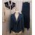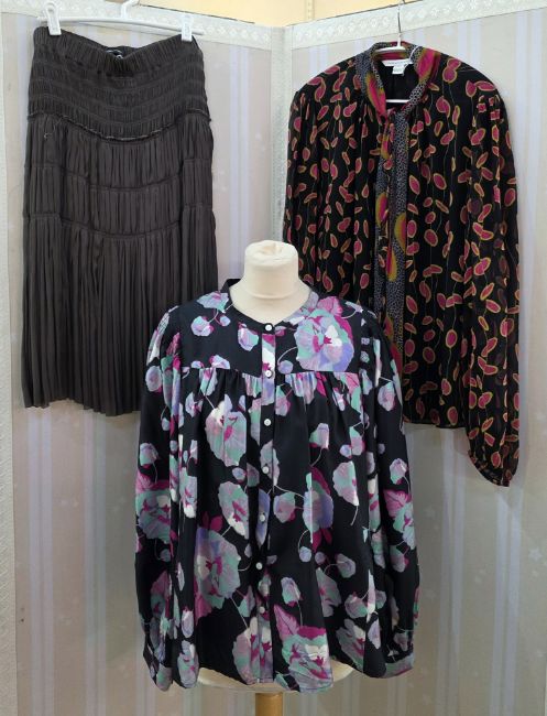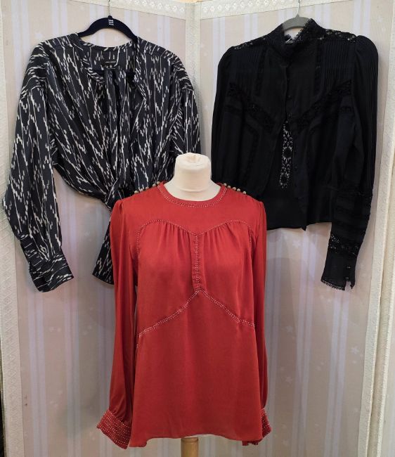Selection of Isabel Morant costume - teal linen/cotton trouser suit, size 42, the jacket edge to edge with no buttons, padded shoulders, silver coloured metal rings belt hooks, the tapered trousers have leather and silver ring lacing knee to ankle, red chiffon smock top with white bead decoration and wooden button detail to the shoulders, a cream and black  'cowboy' style shirt, embroidered, black popper buttons, size 42, black floral printed smock top, smocked detail to the shoulders, size 42, black chiffon and crochet detailed blouse, pin tucks, slight peplum, size 42, grey and white kimono style top, and elasticated skirt, and a Diane von Furstenberg black and crimson blouse (9)