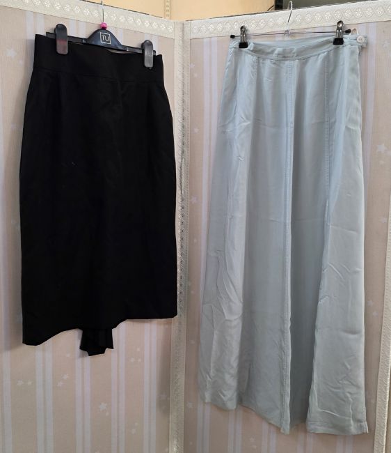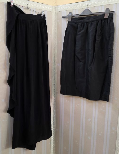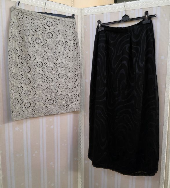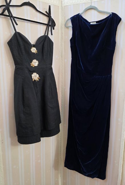 Early 20th century, a black slub satin cocktail dress, bell skirt, sleeveless, the bodice with a sweetheart neckline, embroidered with three appliqued flowers decorated with faux pearls, spaghetti straps with bows at the shoulder, back zip, a blue velvet sleeveless maxi dress, with draped skirt, labelled Joop, a blue lace cocktail dress, labelled Maille Demoiselle Paris, drop waist with godet pleats to the skirt, a brown crepe cocktail dress, deep 'V' to back and front, full skirted from the hip, banded with satin detail, three black evening skirts, a blue maxi skirt labelled Sandwich, small mark to the front of the skirt, a embroidery anglaise crepe skirt, labelled Tifun Collection, and another full length black skirt with figured pattern (10)