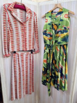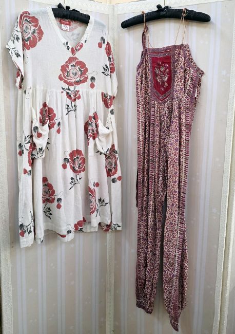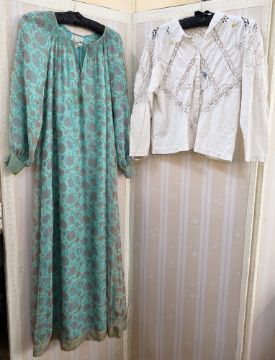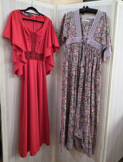 1970's polyester maxi dress, green with paisley style pattern to the 'V' necked bodice and angel sleeves, and to the hem, an orange polyester maxi dress labelled Hilary Floyd of London, with red lame crochet waist and detail to the bodice, angel sleeves, back zip, a Liberty style cotton nightgown/dressing gown labelled Hand Made by Julia Smith for Night Owls London England, quilted detail to the neckline and waist band which has tie ribbon fastening, a jump suit, batik style printed pattern, with double spaghetti straps and side fastening, a white printed cotton sun dress labelled Dorothee Bis made in France printed with large red and black poppies on a white ground, front pockets, dropped shoulders with cat sleeves, a Mexicana style white cotton and lace and embroidered blouse, embroidered with flowers and bees, front button fastening, a smock style maxi dress labelled Made in India for Treacy Lowe, 100% silk printed with an eastern floral design, smocked neckline and cuffed sleeves, a jersey wool suit labelled Masters London, skirt and blazer style top printed with orange, black and brown pattern, red button fastening and red piping detail to the jacket, and a full length maxi skirt and matching waistcoat top labelled Georgio Sant'Angelo printed with tropical colours, green, blue, orange etc (9)