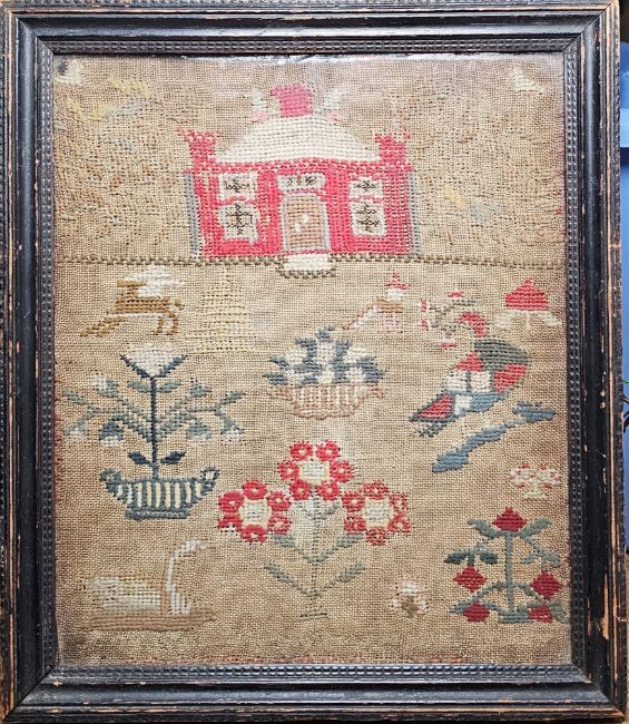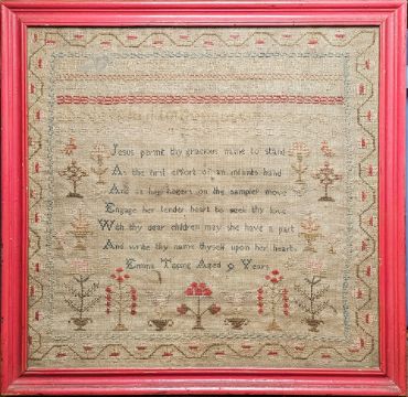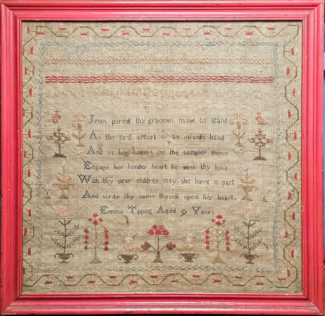 Sampler by Emma Tipping aged 9 years, religious verse, alphabet and numbers, floral border, trees and decorations, colours in red and pink (a little faded), 30cm x 30cm, framed, and a wool sampler, very naïve, showing a house, bird, trees, flowers, etc, 30cm x 25cm, framed (2)
