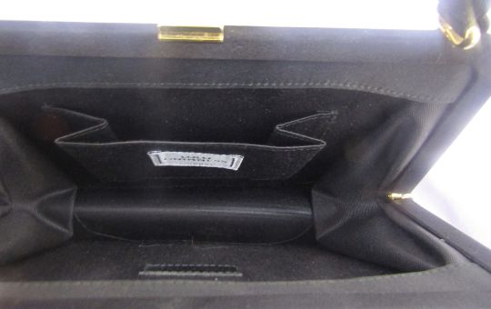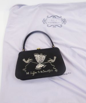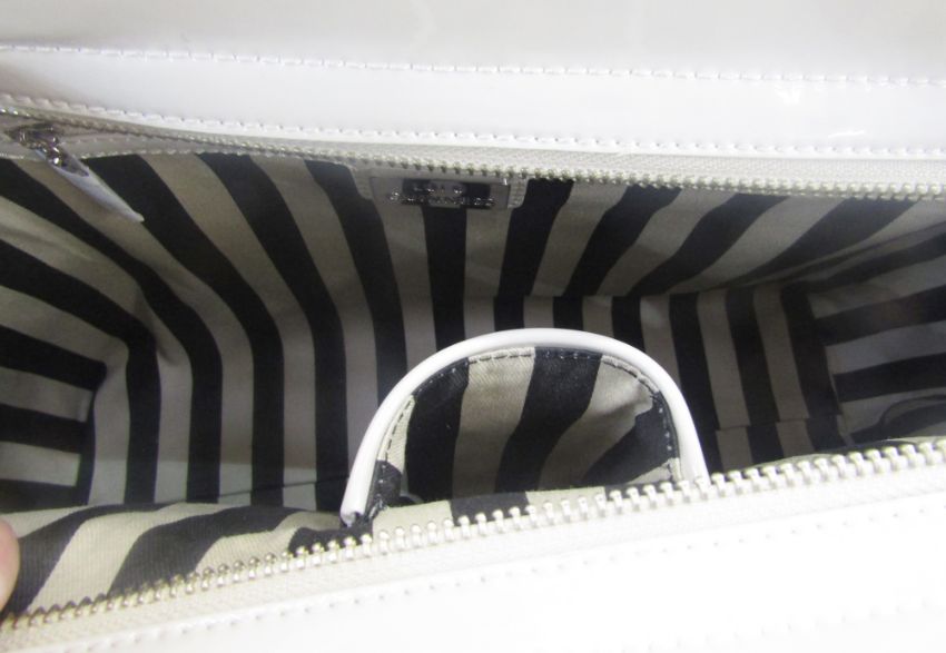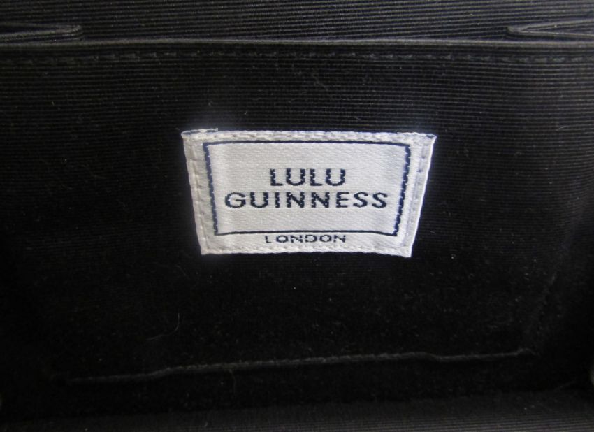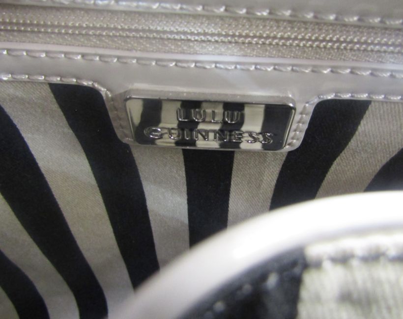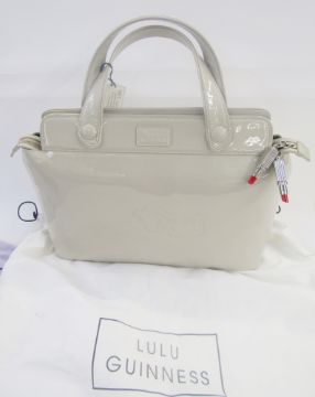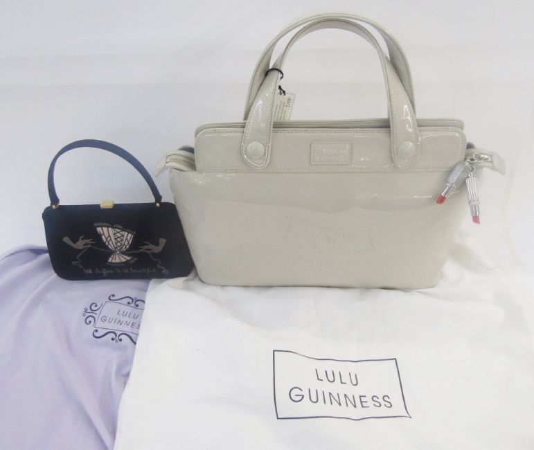 Lulu Guinness patent leather handbag, zip fastening with 'lipstick' charms on the two way zip, inner pockets labelled Lulu Guinness, black and white striped lining, original price tag attached, original dust bag with a Lulu Guinness small fabric evening bag 'We Suffer to be Beautiful', embroidered detail, single handle with a Lulu Guinness dustbag