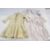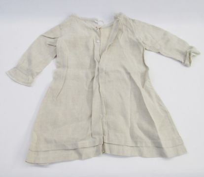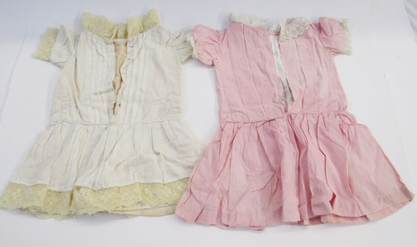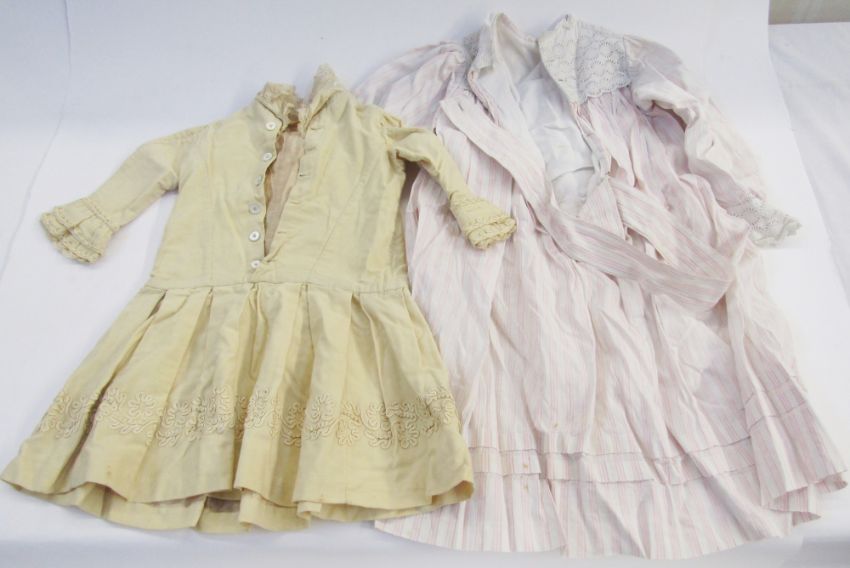 Edwardian child's dress, yellow wool with embroidered ribbon detail, a candy striped pink child's dress with an embroidery anglaise bib collar, embroidery anglaise cuffs, could possibly be a nightgown, a pink child's dress, dropped waist, pintuck pleats to the bodice, embroidery anglaise Peter Pan collar and frill to the puff sleeves, another similar style dress in cream cotton, and a linen smock dress with tie waist and long sleeves, collar and cuffs trimmed with lace (1 box)