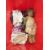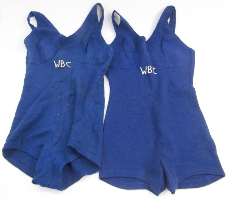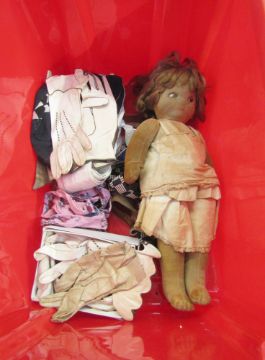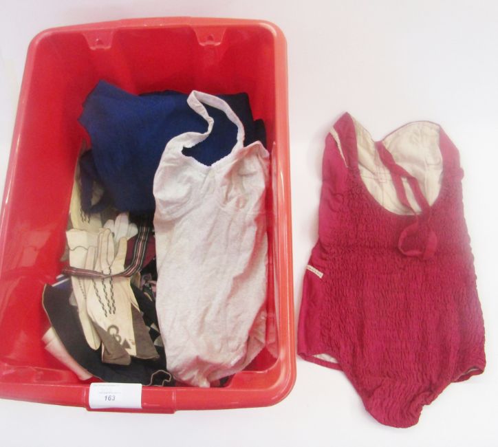 Assorted items to include two vintage knitted swimming costumes with the initials WBC sewn on, a 1950's ruched swimming costume red with rick rack detail, smocked scoop back, halter neck, gentlemen's braces, a pair of lady's embroidered gloves, a pair of child's tiny ballet slippers, kid gloves, a velvet doll and buttons etc. (1 box)