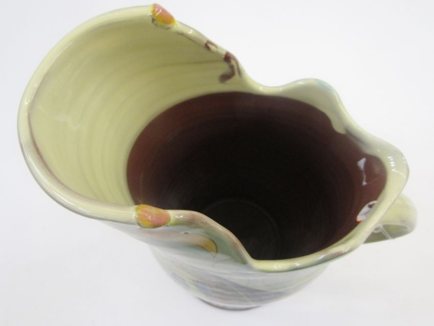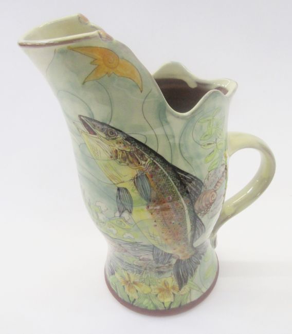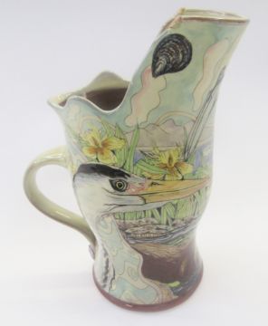 Maureen Minchin, pottery heron jug, decorated with fish, otter, swan and heron, incised mark to base, 25.5cm high x 19cm wide overall.