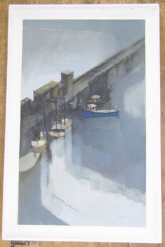 "Evening Landing 1976", boats against harbour wall, labelled and titled verso with Newlyn address, signed and dated 76, 91cm x 55cm