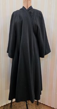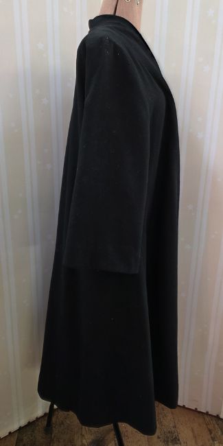 A mid century black duster evening coat, unlabelled, the lining has moth damage and there is moth damage to the coat