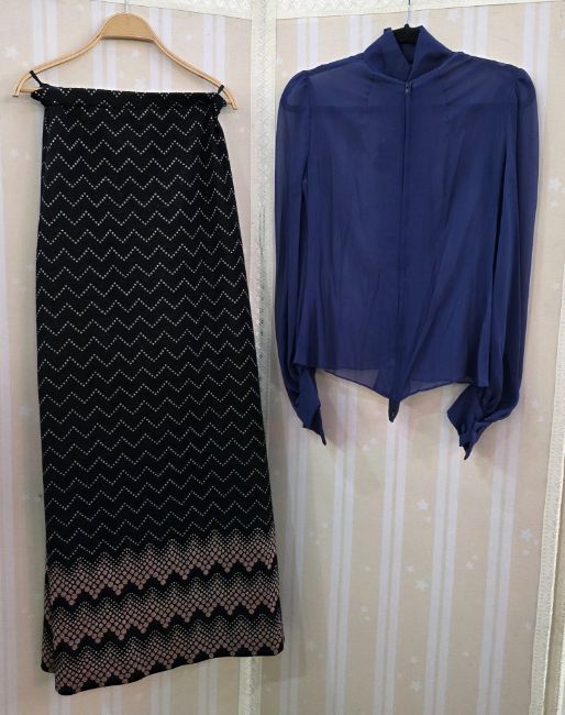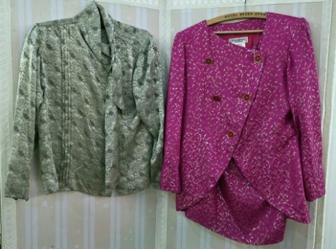 Yves St Laurent pink linen skirt suit, collarless, large 5 black button fastening, size 42, Yves Saint Laurent 'Rive Gauche' pink silk lame skirt suit, double breasted, enamel buttons and to the cuffs, size 42, Emanuel Ungaro silk shirt with pussy bow tie, a blue chiffon blouse labelled Troubadour, and a Lanvin black wool maxi skirt with gold and pink thread pattern, size 40 (5)