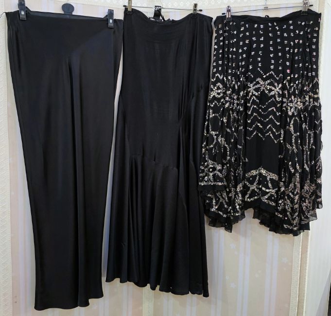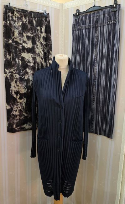'Pleats Please' (Issey Myake) full length blue and grey skirt, a brown and cream printed full length skirt, unlabelled dark blue pleated coatdress, front pocket and front button fastening, Amanda Wakeley satin bias maxi skirt, Betty Barclay black sequined peasant style skirt, and a Donna Karen black satin maxi skirt (6)
