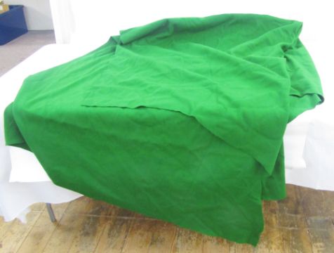 Assorted fabrics to include a good length of green baize, pink and blue check fabric, printed silk, purple satin, etc. (1 box)