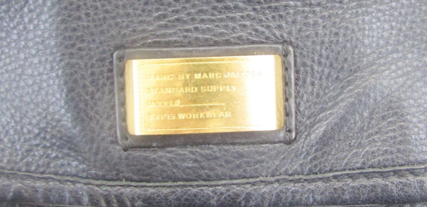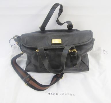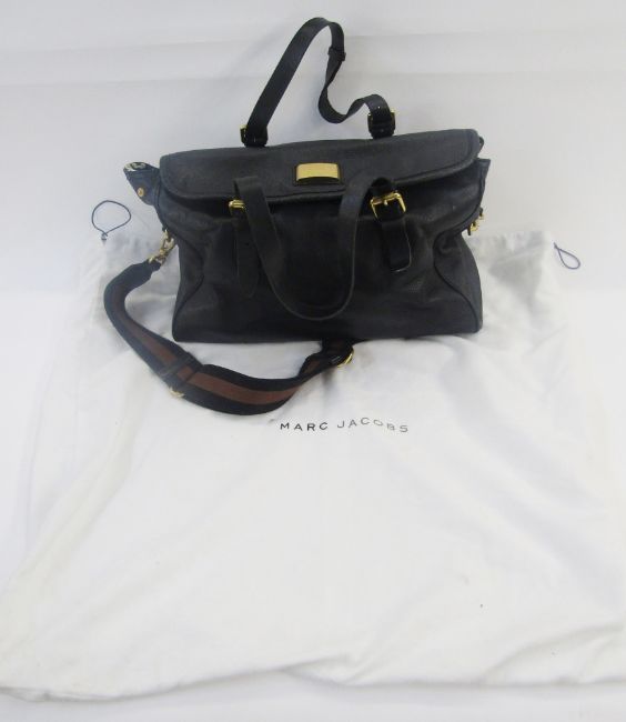 Marc Jacobs black leather holdall/ small weekend bag, brass hardware, lining with the Marc Jacobs logo, carry handles with buckles and black and tan webbing shoulder strap, with the original dustbag