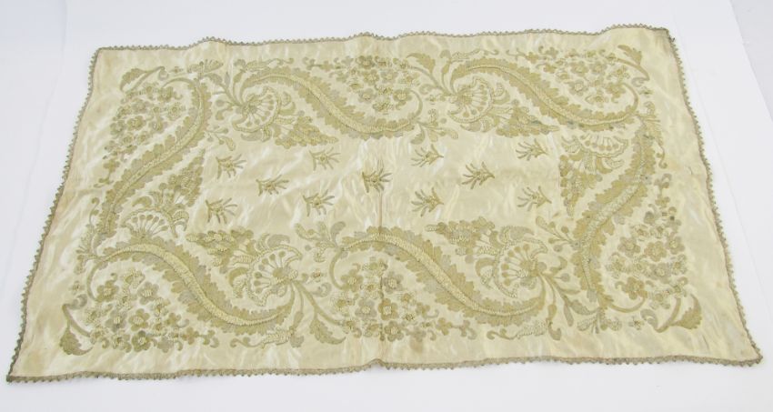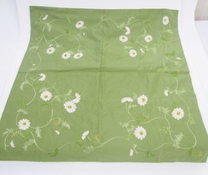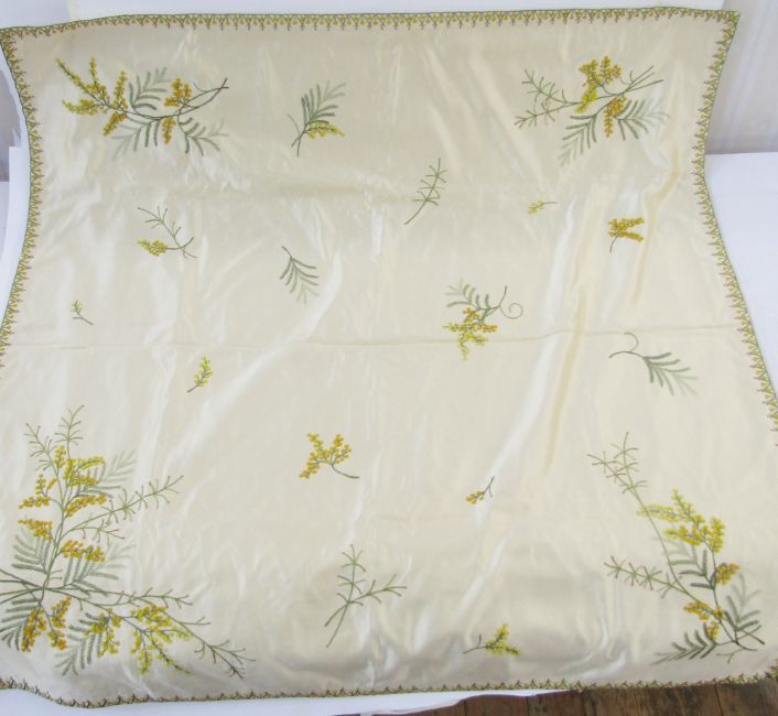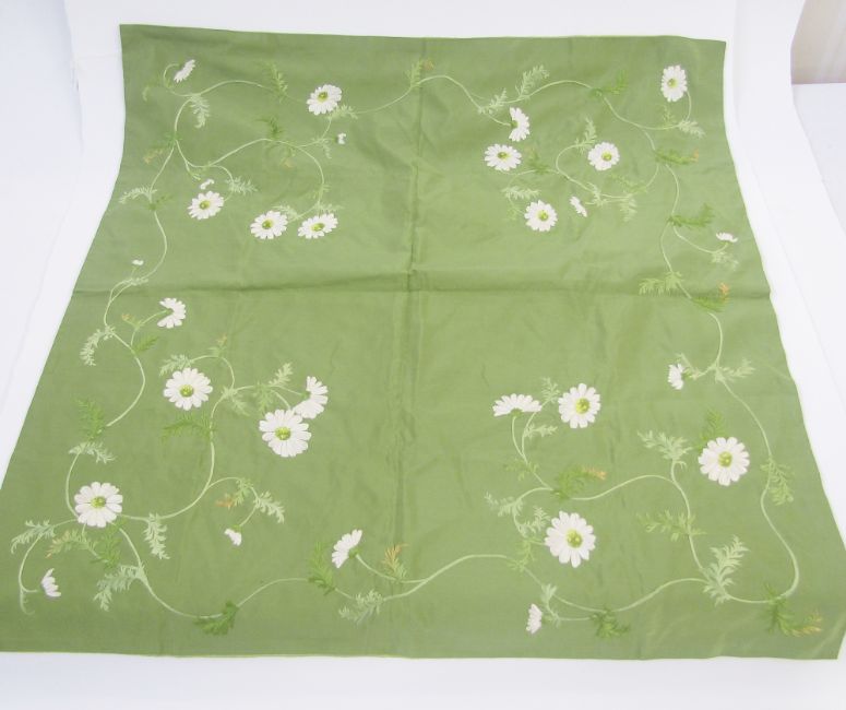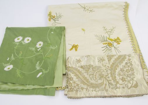 Three various textiles to include antique embroidered silk table runner, embroidered in bullion thread, possibly Turkish, the silk is worn and frayed in parts through age, 34cm x 51cm, a tablecloth, silk, probably circa 1930's/40's embroidered with mimosa and a mimosa border, 123cm x 118cm, and a small green cloth, silk embroidered with margarite daisies, 88cm x 88cm (3)