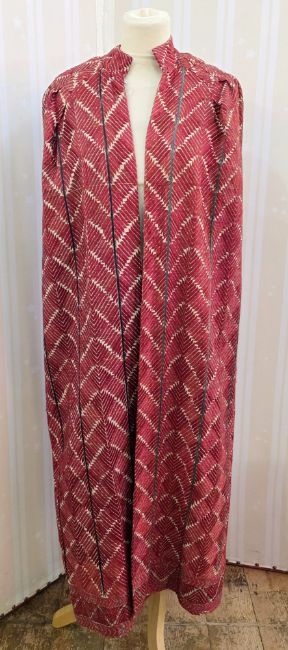 The cloak and lining appear in good condition with no obvious staining.  There is slight wear to the back of the stand-up collar and a few pulled threads around collar area.
