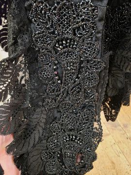 A black Victorian shawl/cape, with figured satin panels, faux jet beaded embellishment with a chiffon lace trim, black lace detail, lace collar, the back panel with faux jet beaded detail, hook and eye fastening to the front, and a inner grosgrain tie belt to keep the back panel secure around the waist