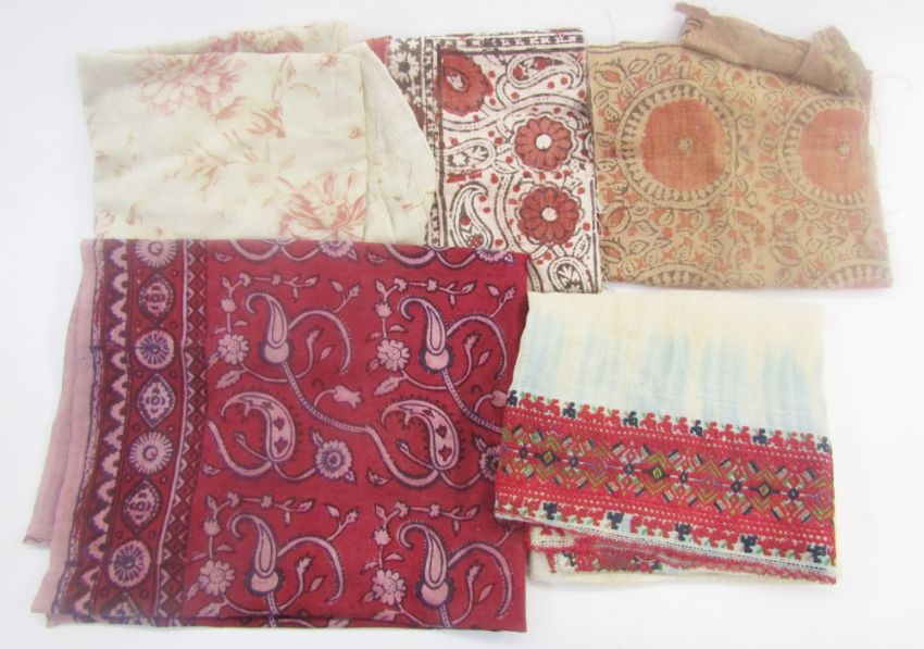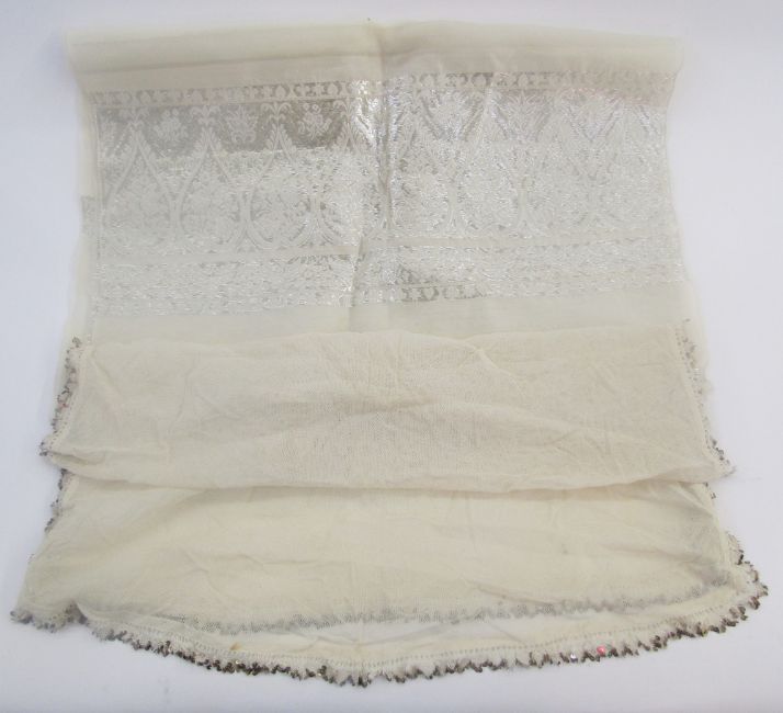 Printed Indian fabric, Turkish Ottoman 18th century embroidery, Balkan, possibly Macedonian pieces, a white Indian shawl silver embroidered, and other items (1 box)