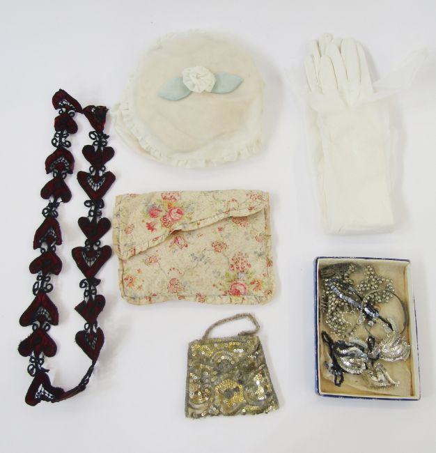 Quantity of assorted mid-century and earlier dress embellishments, to include a diamante and silver-coloured thread belt, the clasp detached, a satin embellished evening bag, a black and red velvet trim detailed with black decoration, a small shoulder shawl decorated with gold and black sequins on black net, a piece of black bobbin lace, a satin handkerchief holder with handkerchiefs, a pair of long white kid evening gloves and an assortment of buttons (4 boxes)