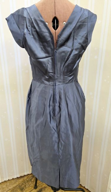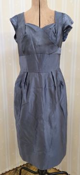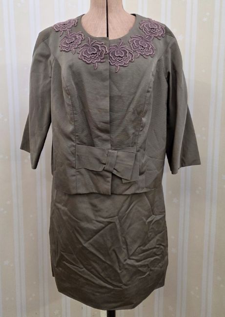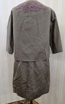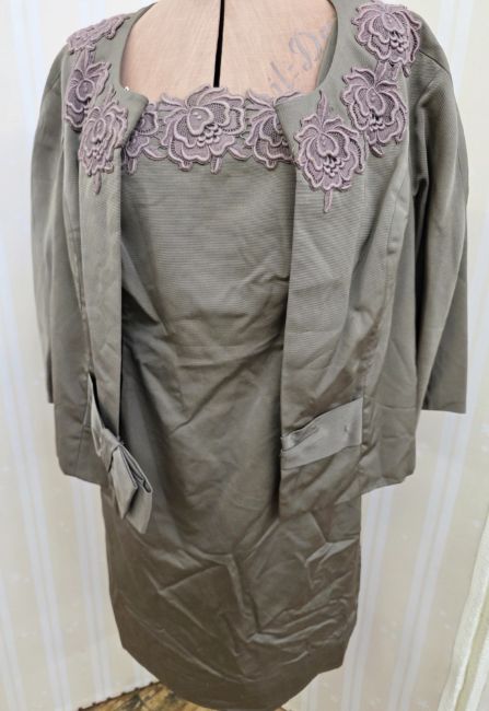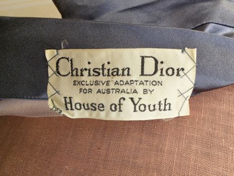 Satin cocktail dress labelled Christian Dior Exclusive Adaptation for Australia by House of Youth, zip and hook and eye fastening at the back, tulip skirt, draped bodice (small mark by one sleeve but no stains), and a 1950's brown grosgrain sleeveless cocktail dress with brown floral lace applique to the front of the bodice, matching short jacket with similar decoration to the neckline, three-quarter length sleeves (2)