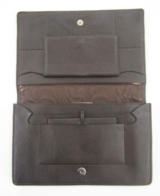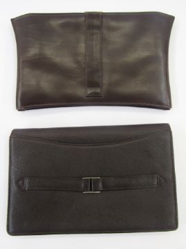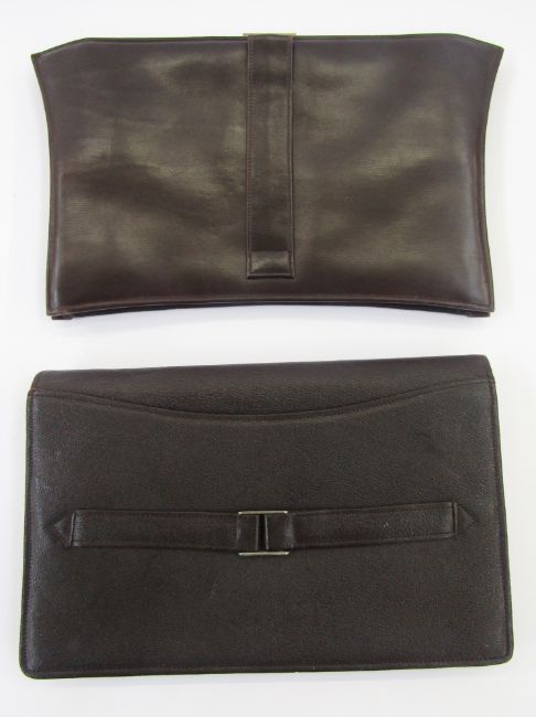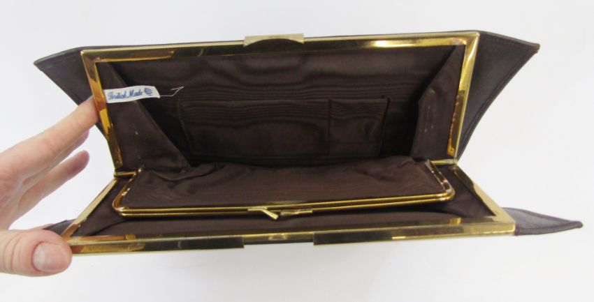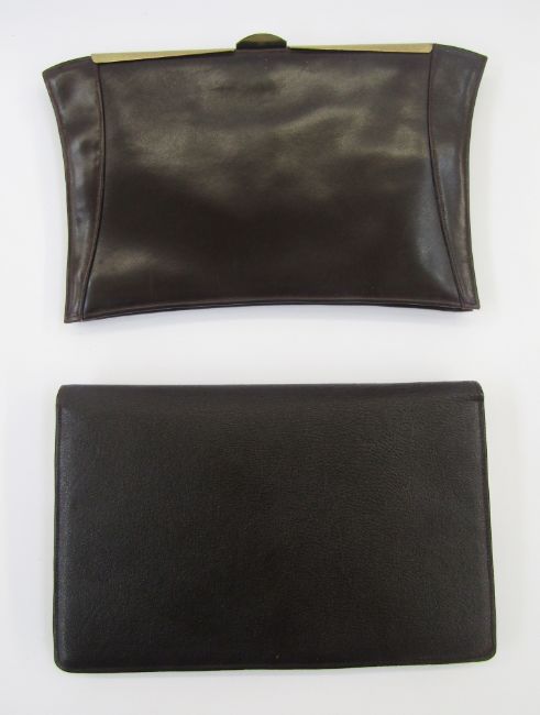 Brown leather mid-century clutch bag with various compartments including an inner purse, attached mirror, little pockets for visiting cards, etc, silver-coloured metal fixed frame and a foldover flap fastening and a strap handle at the back, and another mid-century brown calf leather bag labelled British Made, gold-coloured metal hardware, internal purse and a carry strap (2)