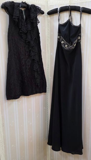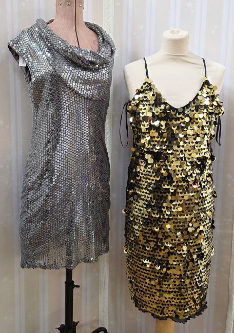 A silver sequin mini dress, designed like chainmail, with cowl neck labelled Terranova, a black crepe mini dress, the front embelished with large gold and black sequins a la Ungaro, spaghetti straps, a black lace mini dress with lace collar and frilled panel, and a Pearce Fonda black polyester maxi dress, with empire line waist embellished with faux pearls, bugle beads and diamante, with spaghetti straps (4)