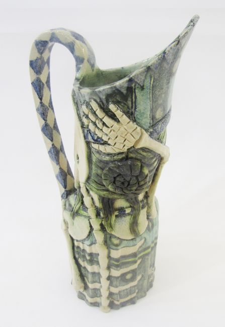 Amanda Popham, earthenware jug, "Memento Mori", figure with skeleton, signed and dated to reverse 2020, 32.5cm high x 11cm wide.
