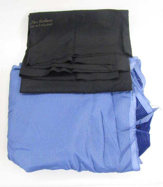 Large quantity of fabrics to include tweed, printed cotton, brocade, a length of 100% pure black cashmere, printed Made in England