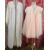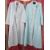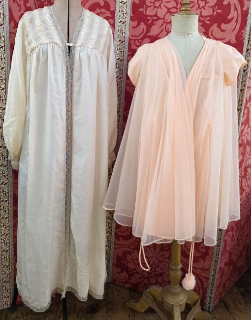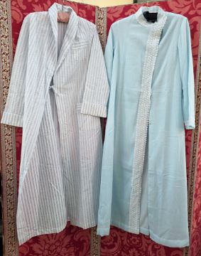 Janet Reger cotton apricot-coloured negligee with ruched and lace detail to the bodice, lace trim to the cuffs and to the edges, labelled Janet Reger, full-length, an apricot-coloured short dressing gown with cap sleeves, a Delfine of Paris blue chiffon and cotton dressing gown with a broderie anglaise trim and mandarin collar and popper fastening, and a white cotton dressing gown printed with a blue striped pattern, front pockets, tie belt (4)