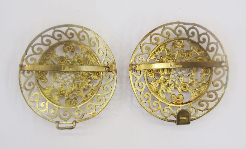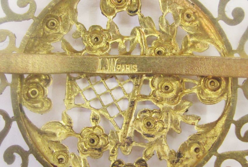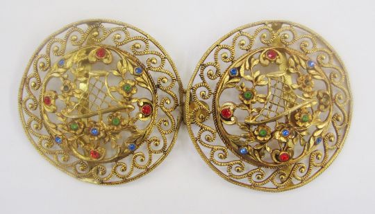 [Louis Wolfers] gilt metal buckle, circular, with central floral design of flowers in a basket and coloured glass stones, initialled LW-Paris, 6cm diameter