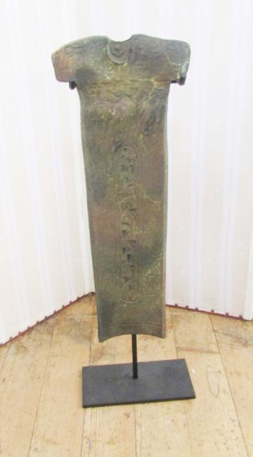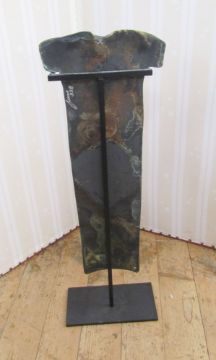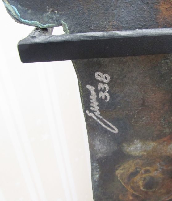 Tony Evans (American) patinated metal-effect modern sculpture, tapering panel with incised shape, signed and numbered to reverse, on metal stand, 93cm high