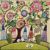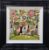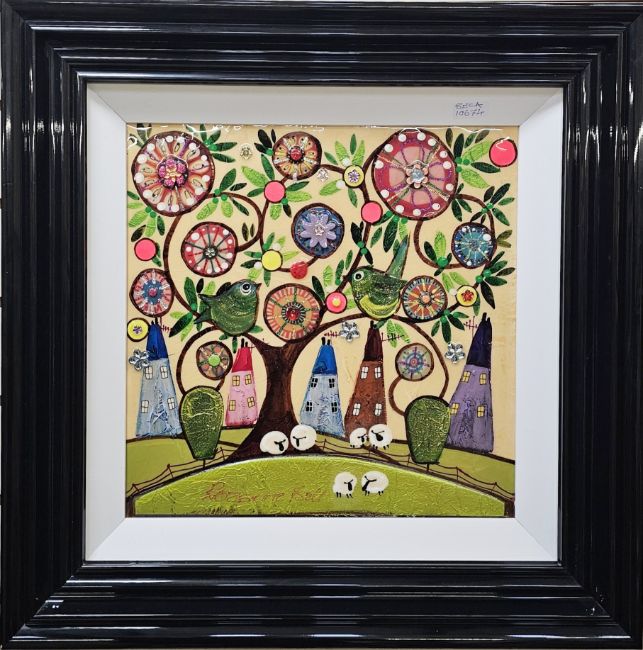 Whimsical landscape with floral tree, buildings and sheep, signed, 40cm square