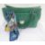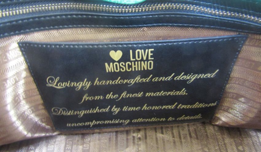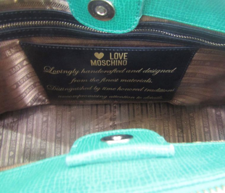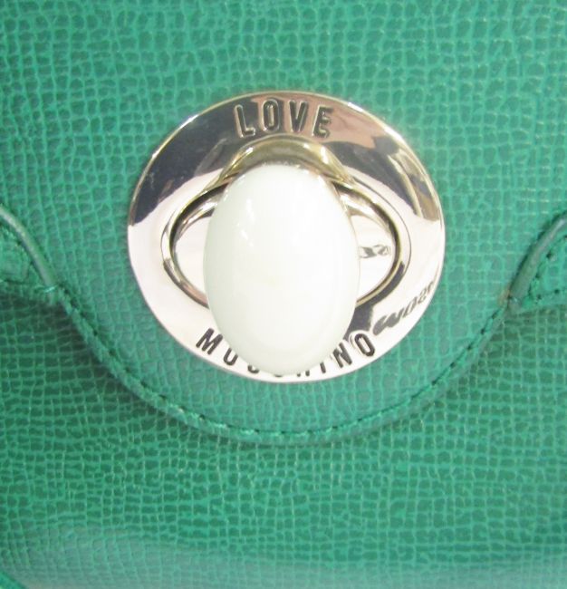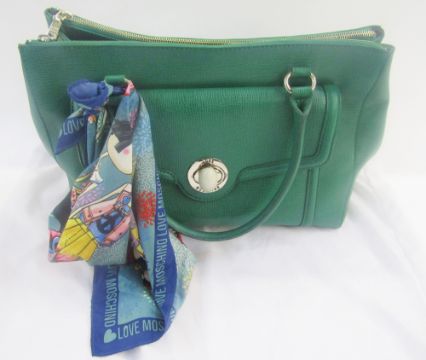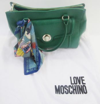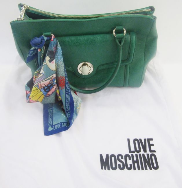 'Love Moschino' green leather handbag, double zipped compartments, a side pocket with silver coloured and faux stone fastening, double handles, zipped pocket inside with 'Love Moschino' label and history, with a 'Love Moschino' silk scarf tied onto one handle