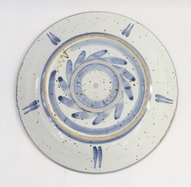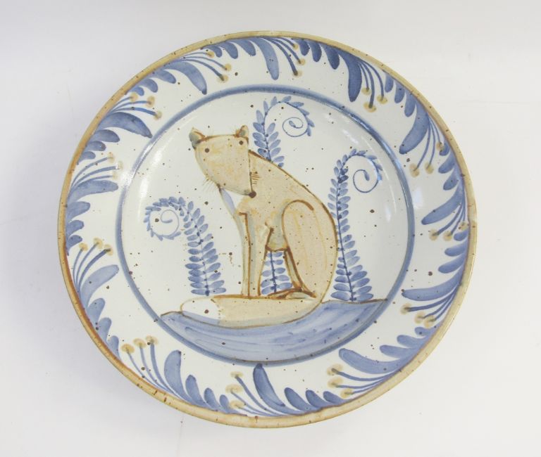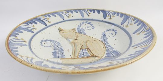 Andrew McGarva pottery bowl, decorated with fox to centre, within blue and white floral border, 40cm diameter.
