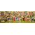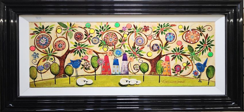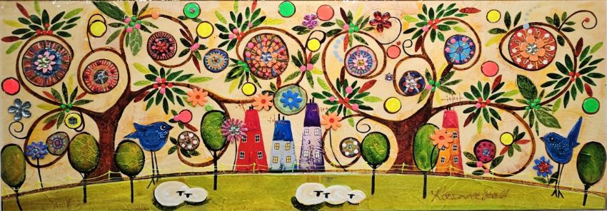 Whimsical landscape with floral tree and buildings, sheep in foreground, signed, 38cm x 100cm