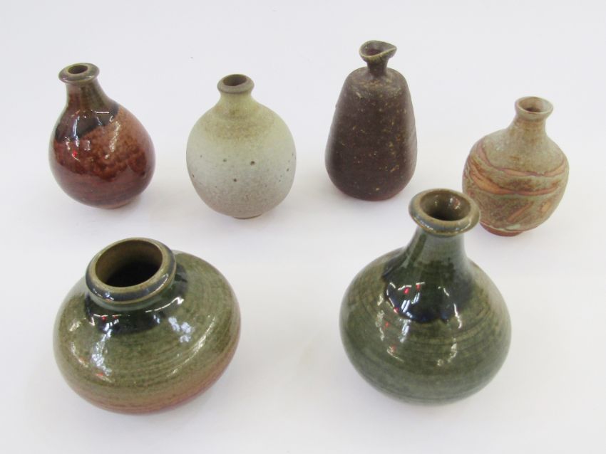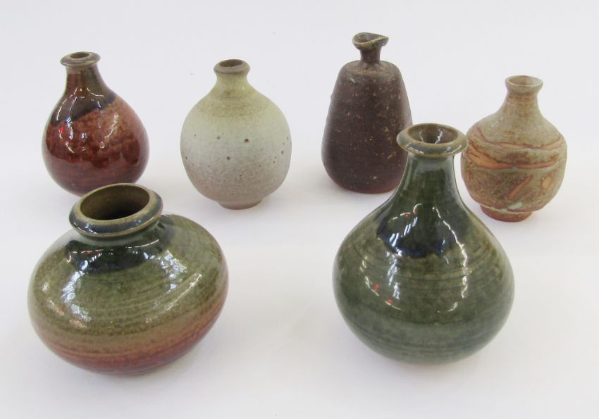 Six various studio pottery bottle-shaped vases in various shades of green, brown and beige (6)