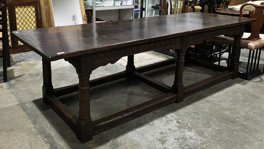 Large oak refectory-style dining table in the 17th century manner, the three-plank top on six turned gun barrel and block legs, united by square stretchers, lunette carved frieze, 77cm high x 283cm long x 91cm wide