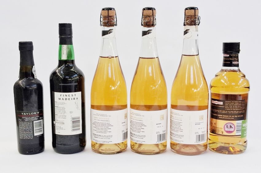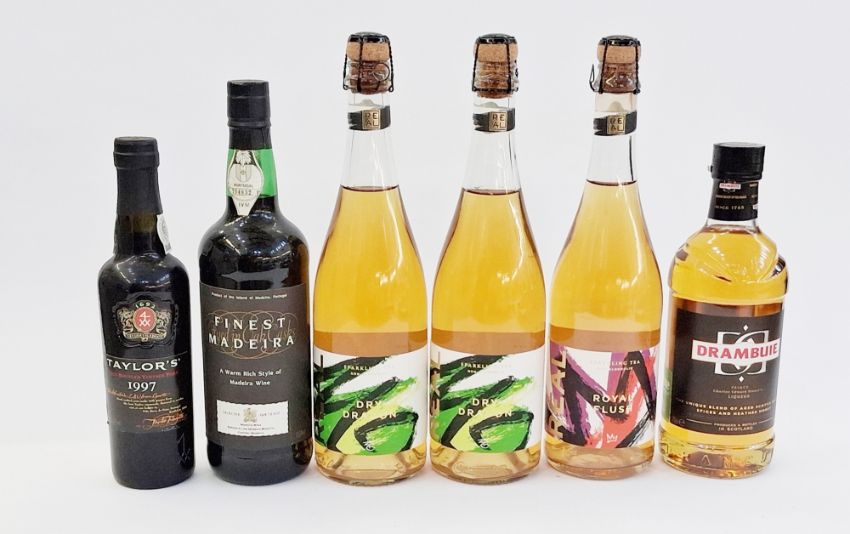Drambuie Prince Charles Edward Stuart's liqueur blended age Scotch whisky spices and honey, 700ml, 40% vol, Taylors late bottled vintage port 1997, 35.7cl, 20% vol, Finest Madeira selected for Tesco, 75cl, 17.5% vol, and three bottles of Dry Dragon non-alcoholic sparkling tea