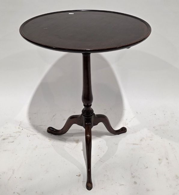 George III mahogany table, the circular single plank tray tilt-top on a turned baluster support and three outswept legs, 75cm high x 61cm diameter  Provenance:  Hicks Beach Estate.  The majority of pieces in this collection originate from Williamstrip, Coln St Aldwyn, family seat from 1788 to 2008 and thereafter Mill House, Coln St Aldwyn.  Sir Michael Hicks Beach, Bt, succeeded his father as 9th Baronet of Beverston in 1854.  He became a Conservative Member of Parliament in 1864 and served twice as Chancellor of the Exchequer, from 1885 to 1886 and again from 1895 to 1902.  In 1906 he was raised to the peerage as Viscount St Aldwyn and in 1915 became the first Earl St Aldwyn.