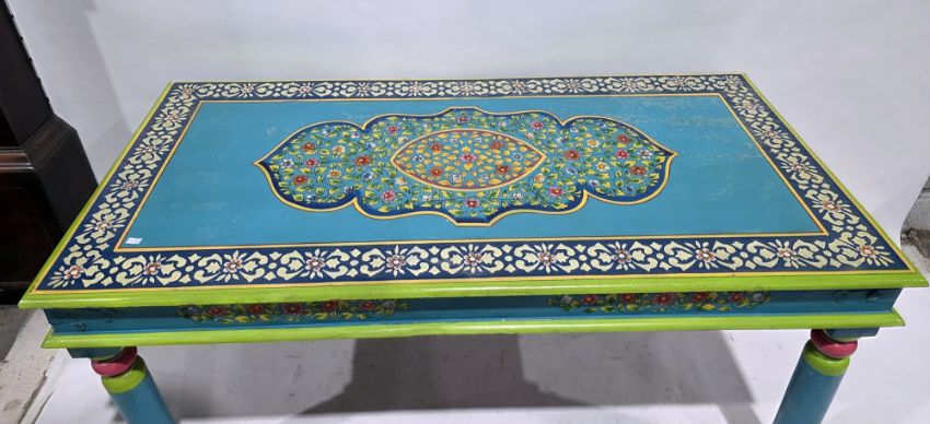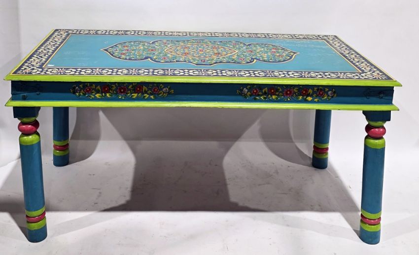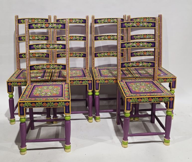 Kare Designs brightly painted dining suite comprising a rectangular dining table painted blue, turquoise and green with floral decoration, 78cm high x 160cm long x 81cm wide and six ladderback dining chairs with hard seats, painted purple with floral decoration, 104cm high x 41cm wide x 43cm deep (7)