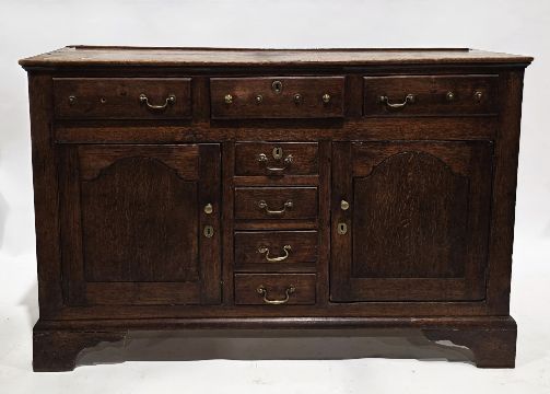 George III oak dresser base having three frieze drawers over four central drawers flanked either side by panel cupboard doors, brass handles (some lacking), on bracket feet, 92cm high x 141cm wide x 50cm deep