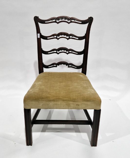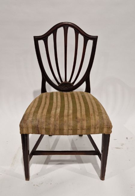 Chippendale-style mahogany dining chair with pierced ladderback, stuffover seat and square legs united by an H-stretcher, 95cm high x 56cm wide x 53cm deep and a Hepplewhite-style mahogany dining chair with shield-shaped back, stuffover seat, on square tapering legs united by an H-stretcher, 94cm high x 52cm wide x 51cm deep (2)