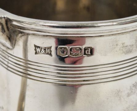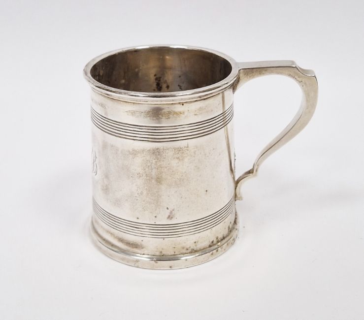 Silver mug by Walker & Hall, Sheffield 1921, of tapering circular form with engraved bands, scroll handle and engraved with monogram, 7cm high, 4ozt approx (please note VAT will be payable on the hammer)