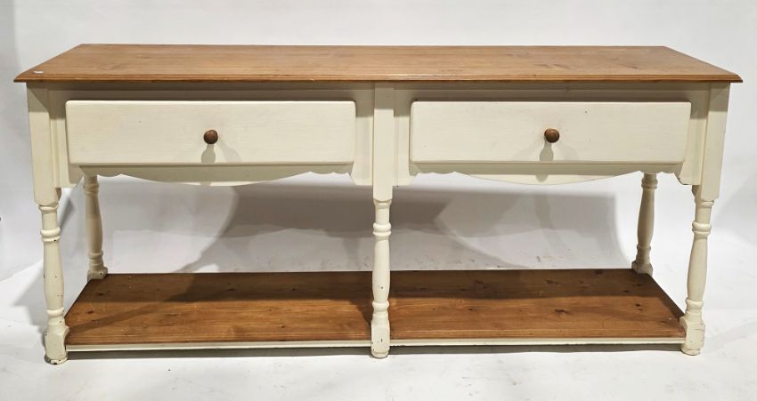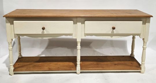 Pine dresser base, partially painted cream with two frieze drawers having wooden knob handles, open pot shelf below, on turned baluster and block supports, 79cm high x 174cm wide x 44cm deep