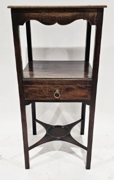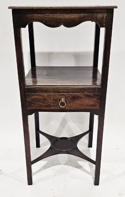 Early 19th century mahogany washstand of square form, the shaped frieze over a shelf with drawer below, having a brass drop ring handle, wash jug shelf to base, on square chamfered legs, 83cm high x 38cm wide  Provenance:  Hicks Beach Estate.  The majority of pieces in this collection originate from Williamstrip, Coln St Aldwyn, family seat from 1788 to 2008 and thereafter Mill House, Coln St Aldwyn.  Sir Michael Hicks Beach, Bt, succeeded his father as 9th Baronet of Beverston in 1854.  He became a Conservative Member of Parliament in 1864 and served twice as Chancellor of the Exchequer, from 1885 to 1886 and again from 1895 to 1902.  In 1906 he was raised to the peerage as Viscount St Aldwyn and in 1915 became the first Earl St Aldwyn.
